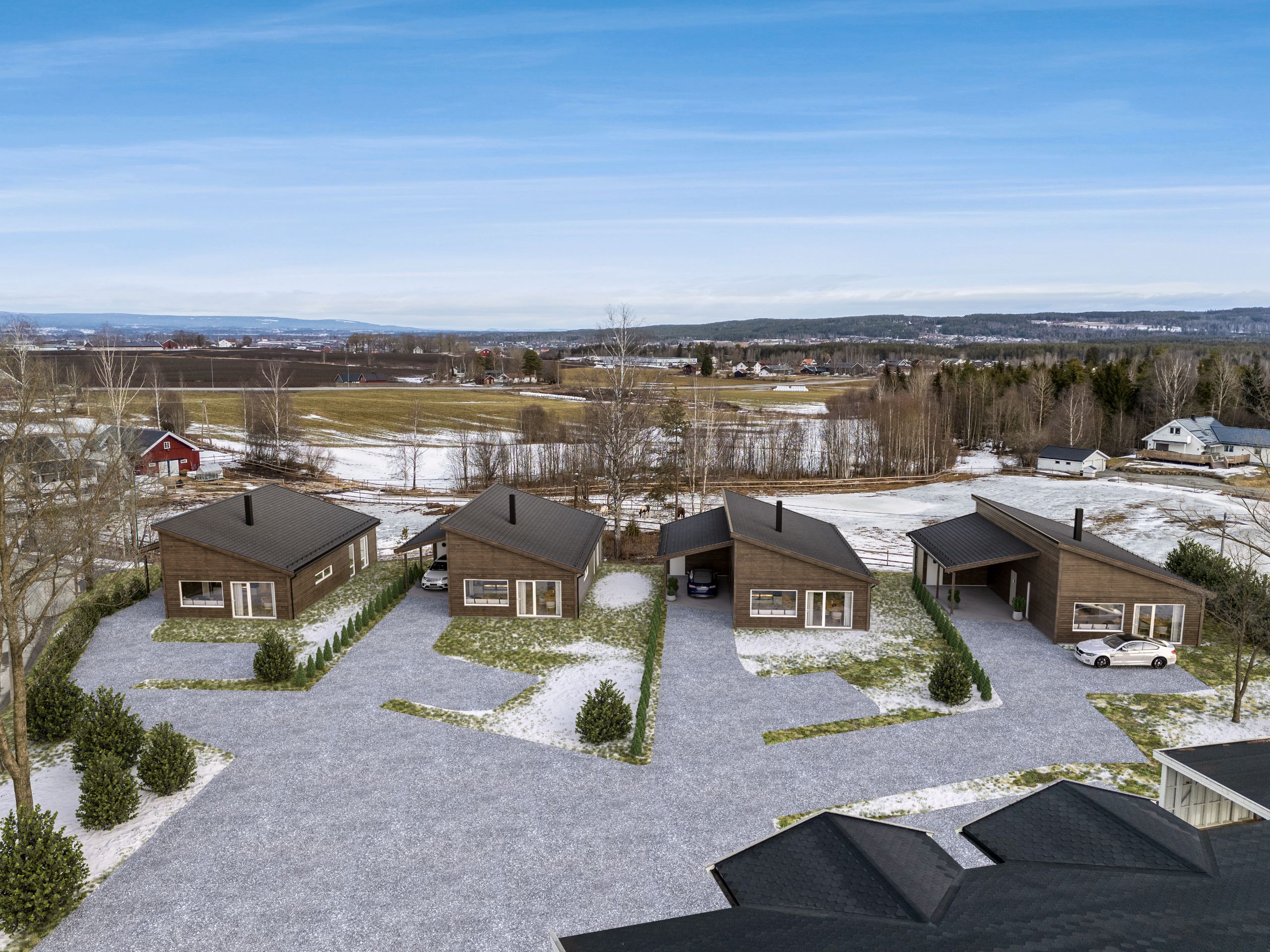 Velkommen til fire nyoppførte eneboliger på ett plan, beliggende landlig til mellom Stange og Romedal. Disse moderne boligene på 100kvm tilbyr en smart og praktisk planløsning med tre soverom, et stilrent kjøkken fra Nobilia med integrerte hvitevarer, og et lekkert flislagt bad.
